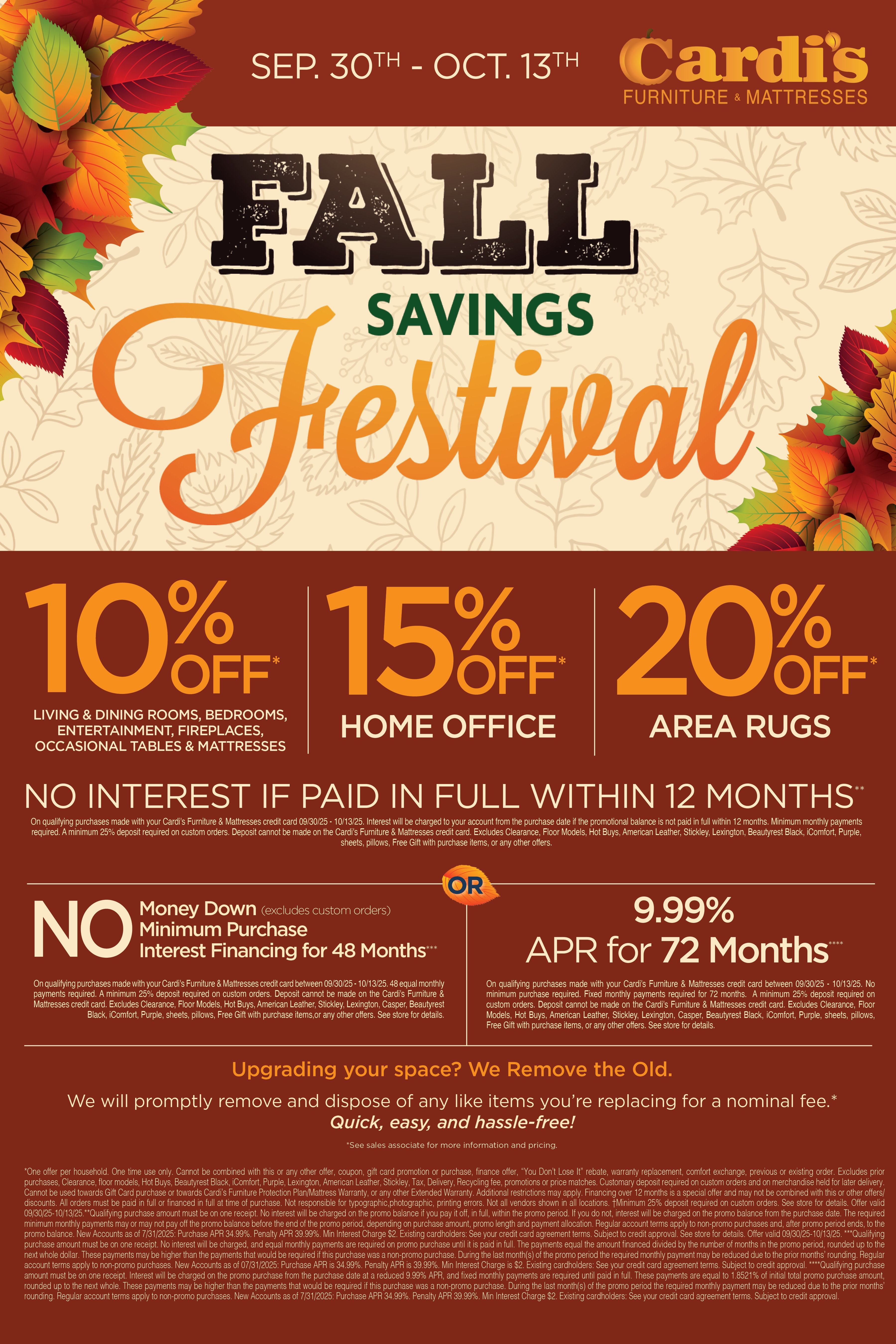 *One offer per household. One time use only. Cannot be combined with this or any other offer, coupon, gift card promotion or purchase, finance offer, “You Don’t Lose It” rebate, warranty replacement, comfort exchange, previous or existing order. Excludes prior purchases, Clearance, floor models, Hot Buys, Beautyrest Black, iComfort, Purple, Lexington, American Leather, Stickley, Tax, Delivery, Recycling fee, promotions or price matches. Customary deposit required on custom orders and on merchandise held for later delivery. Cannot be used towards Gift Card purchase or towards Cardi’s Furniture Protection Plan/Mattress Warranty, or any other Extended Warranty. Additional restrictions may apply. Financing over 12 months is a special offer and may not be combined with this or other offers/discounts. All orders must be paid in full or financed in full at time of purchase. Not responsible for typographic,photographic, printing errors. Not all vendors shown in all locations. †Minimum 25% deposit required on custom orders. See store for details. Offer valid 09/30/25-10/13/25.**Qualifying purchase amount must be on one receipt. No interest will be charged on the promo balance if you pay it off, in full, within the promo period. If you do not, interest will be charged on the promo balance from the purchase date. The required minimum monthly payments may or may not pay off the promo balance before the end of the promo period, depending on purchase amount, promo length and payment allocation. Regular account terms apply to non-promo purchases and, after promo period ends, to the promo balance. New Accounts as of 7/31/2025: Purchase APR 34.99%. Penalty APR 39.99%. Min Interest Charge $2. Existing cardholders: See your credit card agreement terms. Subject to credit approval. See store for details. Offer valid 09/30/25-10/13/25. ***Qualifying purchase amount must be on one receipt. No interest will be charged, and equal monthly payments are required on promo purchase until it is paid in full. The payments equal the amount financed divided by the number of months in the promo period, rounded up to the next whole dollar. These payments may be higher than the payments that would be required if this purchase was a non-promo purchase. During the last month(s) of the promo period the required monthly payment may be reduced due to the prior months’ rounding. Regular account terms apply to non-promo purchases. New Accounts as of 07/31/2025: Purchase APR is 34.99%. Penalty APR is 39.99%. Min Interest Charge is $2. Existing cardholders: See your credit card agreement terms. Subject to credit approval. ****Qualifying purchase amount must be on one receipt. Interest will be charged on the promo purchase from the purchase date at a reduced 9.99% APR, and fixed monthly payments are required until paid in full. These payments are equal to 1.8521% of initial total promo purchase amount, rounded up to the next whole. These payments may be higher than the payments that would be required if this purchase was a non-promo purchase. During the last month(s) of the promo period the required monthly payment may be reduced due to the prior months’ rounding. Regular account terms apply to non-promo purchases. New Accounts as of 7/31/2025: Purchase APR 34.99%. Penalty APR 39.99%. Min Interest Charge $2. Existing cardholders: See your credit card agreement terms. Subject to credit approval.