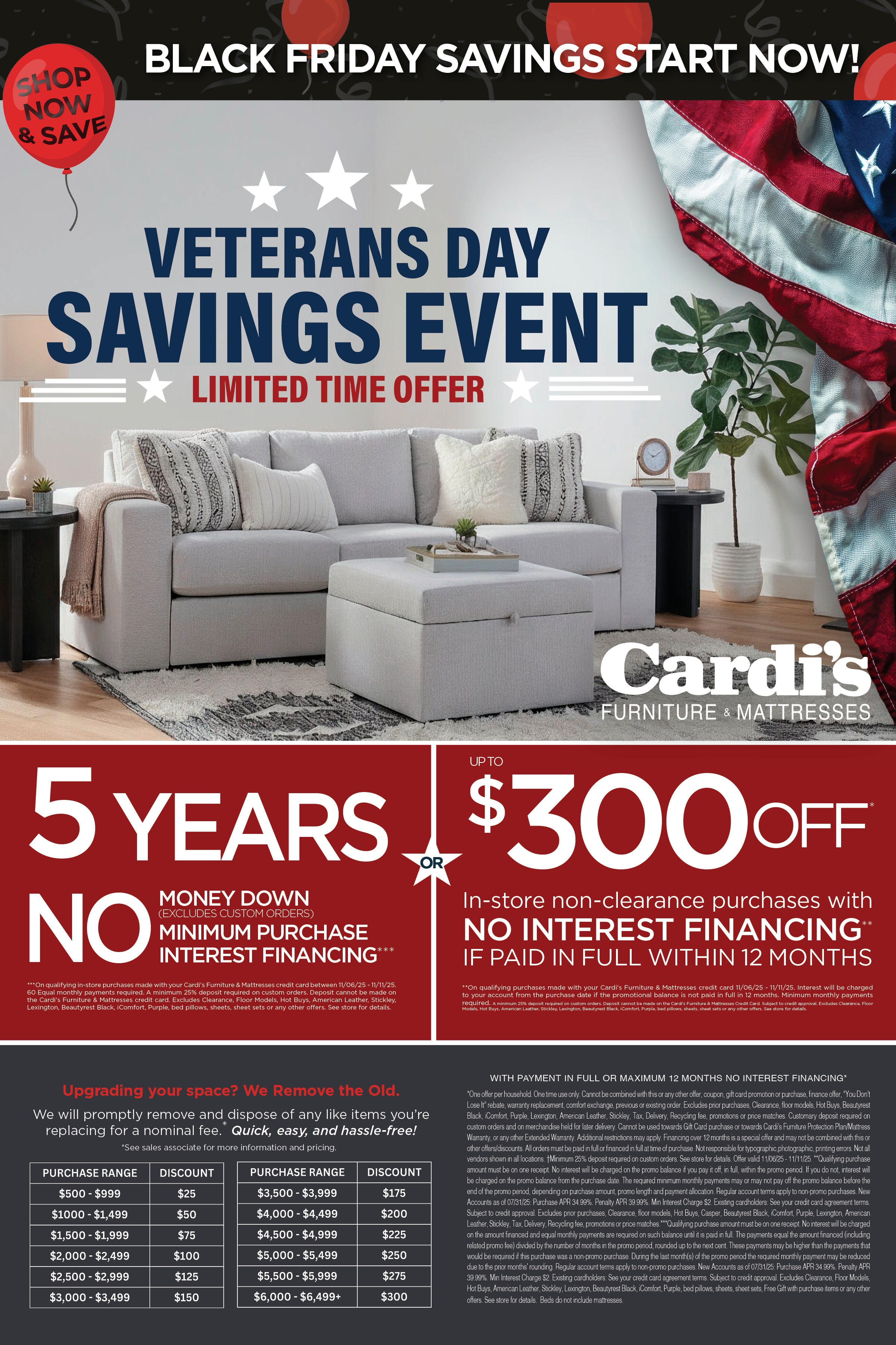 *One offer per household. One time use only. Cannot be combined with this or any other offer, coupon, gift card promotion or purchase, finance offer, “You Don’t Lose It” rebate, warranty replacement, comfort exchange, previous or existing order. Excludes prior purchases, Clearance, floor models, Hot Buys, Beautyrest Black, iComfort, Purple, Lexington, American Leather, Stickley, Tax, Delivery, Recycling fee, promotions or price matches. Customary deposit required on custom orders and on merchandise held for later delivery. Cannot be used towards Gift Card purchase or towards Cardi’s Furniture Protection Plan/Mattress Warranty, or any other Extended Warranty. Additional restrictions may apply. Financing over 12 months is a special offer and may not be combined with this or other offers/discounts. All orders must be paid in full or financed in full at time of purchase. Not responsible for typographic,photographic, printing errors. Not all vendors shown in all locations. †Minimum 25% deposit required on custom orders. See store for details. Offer valid 11/06/25 - 11/11/25. **Qualifying purchase amount must be on one receipt. No interest will be charged on the promo balance if you pay it off, in full, within the promo period. If you do not, interest will be charged on the promo balance from the purchase date. The required minimum monthly payments may or may not pay off the promo balance before the end of the promo period, depending on purchase amount, promo length and payment allocation. Regular account terms apply to non-promo purchases. New Accounts as of 07/31/25: Purchase APR 34.99%. Penalty APR 39.99%. Min Interest Charge $2. Existing cardholders: See your credit card agreement terms. Subject to credit approval. Excludes prior purchases, Clearance, floor models, Hot Buys, Casper, Beautyrest Black, iComfort, Purple, Lexington, American Leather, Stickley, Tax, Delivery, Recycling fee, promotions or price matches.***Qualifying purchase amount must be on one receipt. No interest will be charged on the amount financed and equal monthly payments are required on such balance until it is paid in full. The payments equal the amount financed (including related promo fee) divided by the number of months in the promo period, rounded up to the next cent. These payments may be higher than the payments that would be required if this purchase was a non-promo purchase. During the last month(s) of the promo period the required monthly payment may be reduced due to the prior months' rounding. Regular account terms apply to non-promo purchases. New Accounts as of 07/31/25: Purchase APR 34.99%. Penalty APR 39.99%. Min Interest Charge $2. Existing cardholders: See your credit card agreement terms. Subject to credit approval. Excludes Clearance, Floor Models, Hot Buys, American Leather, Stickley, Lexington, Beautyrest Black, iComfort, Purple, bed pillows, sheets, sheet sets, Free Gift with purchase items or any other offers. See store for details. Beds do not include mattresses.