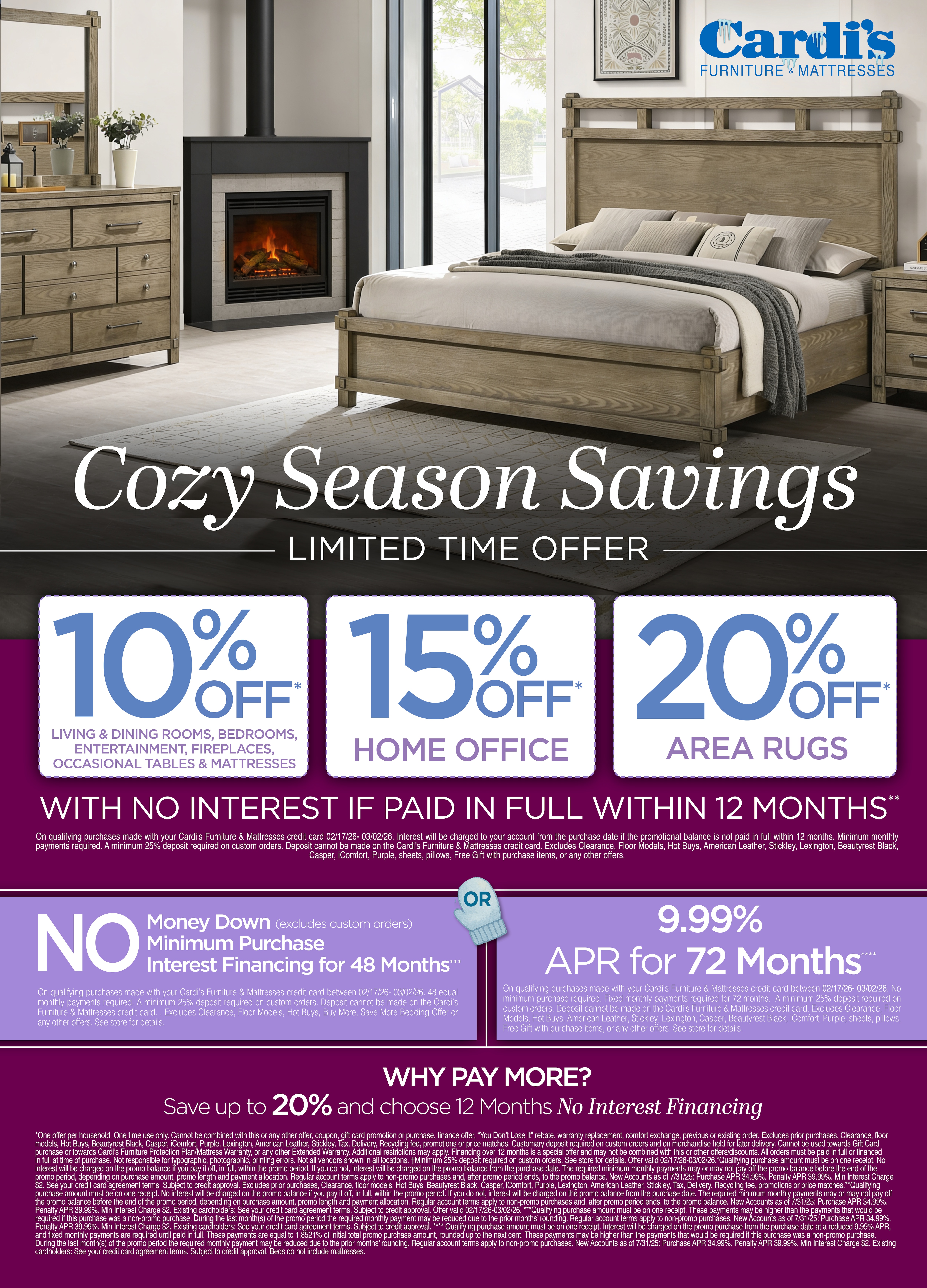 *One offer per household. One time use only. Cannot be combined with this or any other offer, coupon, gift card promotion or purchase, finance offer, “You Don’t Lose It” rebate, warranty replacement, comfort exchange, previous or existing order. Excludes prior purchases, Clearance, floor models, Hot Buys, Beautyrest Black, Casper, iComfort, Purple, Lexington, American Leather, Stickley, Tax, Delivery, Recycling fee, promotions or price matches. Customary deposit required on custom orders and on merchandise held for later delivery. Cannot be used towards Gift Card purchase or towards Cardi’s Furniture Protection Plan/Mattress Warranty, or any other Extended Warranty. Additional restrictions may apply. Financing over 12 months is a special offer and may not be combined with this or other offers/discounts. All orders must be paid in full or financed in full at time of purchase. Not responsible for typographic, photographic, printing errors. Not all vendors shown in all locations. †Minimum 25% deposit required on custom orders. See store for details. Offer valid 02/17/26-03/02/26.*Qualifying purchase amount must be on one receipt. No interest will be charged on the promo balance if you pay it off, in full, within the promo period. If you do not, interest will be charged on the promo balance from the purchase date. The required minimum monthly payments may or may not pay off the promo balance before the end of the promo period, depending on purchase amount, promo length and payment allocation. Regular account terms apply to non-promo purchases and, after promo period ends, to the promo balance. New Accounts as of 7/31/25: Purchase APR 34.99%. Penalty APR 39.99%. Min Interest Charge $2. See your credit card agreement terms. Subject to credit approval. Excludes prior purchases, Clearance, floor models, Hot Buys, Beautyrest Black, Casper, iComfort, Purple, Lexington, American Leather, Stickley, Tax, Delivery, Recycling fee, promotions or price matches.**Qualifying purchase amount must be on one receipt. No interest will be charged on the promo balance if you pay it off, in full, within the promo period. If you do not, interest will be charged on the promo balance from the purchase date. The required minimum monthly payments may or may not pay off the promo balance before the end of the promo period, depending on purchase amount, promo length and payment allocation. Regular account terms apply to non-promo purchases and, after promo period ends, to the promo balance. New Accounts as of 7/31/25: Purchase APR 34.99%. Penalty APR 39.99%. Min Interest Charge $2. Existing cardholders: See your credit card agreement terms. Subject to credit approval. Offer valid 02/17/26-03/02/26. ***Qualifying purchase amount must be on one receipt. These payments may be higher than the payments that would be required if this purchase was a non-promo purchase. During the last month(s) of the promo period the required monthly payment may be reduced due to the prior months’ rounding. Regular account terms apply to non-promo purchases. New Accounts as of 7/31/25: Purchase APR 34.99%. Penalty APR 39.99%. Min Interest Charge $2. Existing cardholders: See your credit card agreement terms. Subject to credit approval. **** Qualifying purchase amount must be on one receipt. Interest will be charged on the promo purchase from the purchase date at a reduced 9.99% APR, and fixed monthly payments are required until paid in full. These payments are equal to 1.8521% of initial total promo purchase amount, rounded up to the next cent. These payments may be higher than the payments that would be required if this purchase was a non-promo purchase. During the last month(s) of the promo period the required monthly payment may be reduced due to the prior months’ rounding. Regular account terms apply to non-promo purchases. New Accounts as of 7/31/25: Purchase APR 34.99%. Penalty APR 39.99%. Min Interest Charge $2. Existing cardholders: See your credit card agreement terms. Subject to credit approval. Beds do not include mattresses.