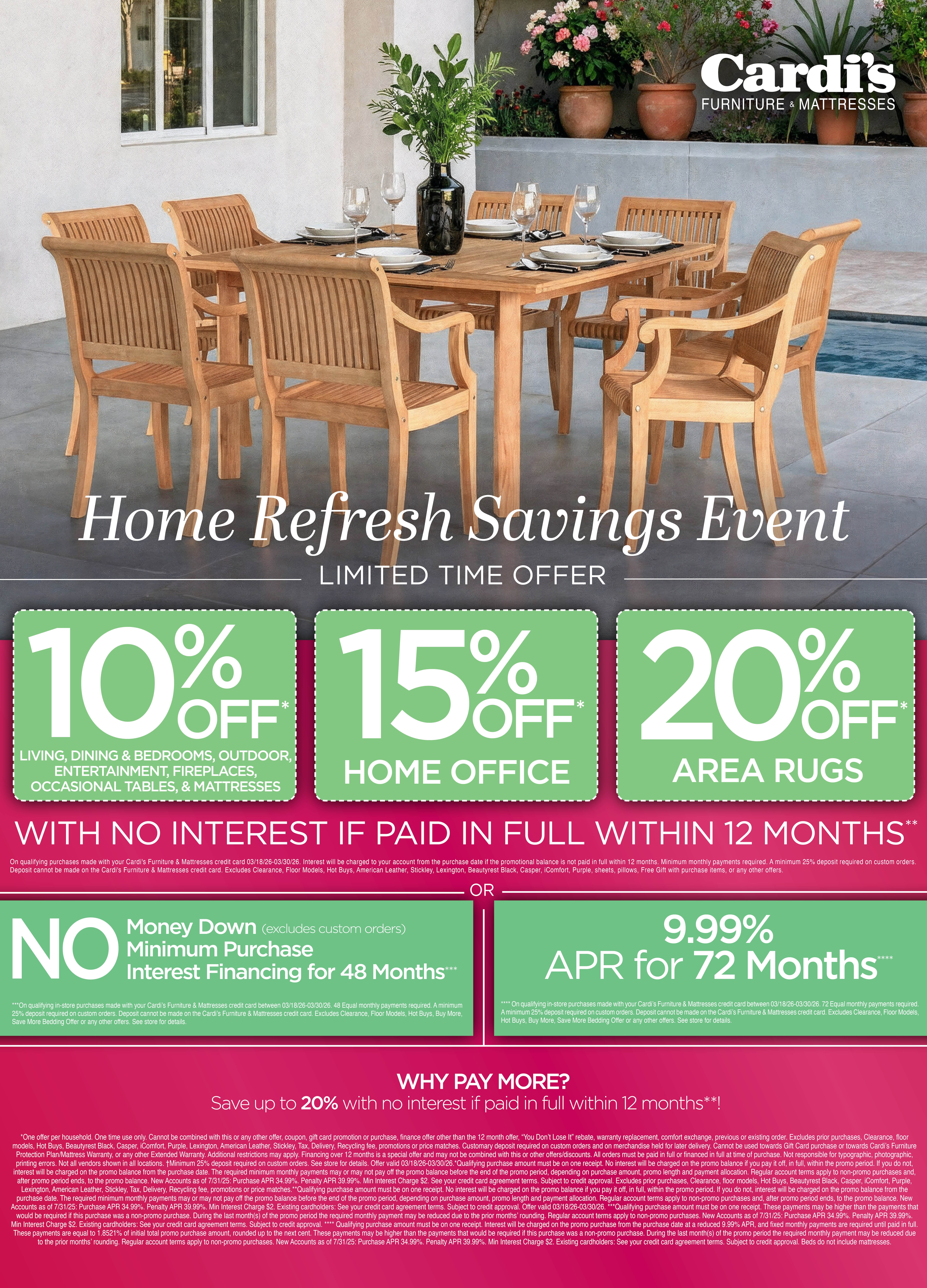 *One offer per household. One time use only. Cannot be combined with this or any other offer, coupon, gift card promotion or purchase, finance offer other than the 12 month offer, “You Don’t Lose It” rebate, warranty replacement, comfort exchange, previous or existing order. Excludes prior purchases, Clearance, floor models, Hot Buys, Beautyrest Black, Casper, iComfort, Purple, Lexington, American Leather, Stickley, Tax, Delivery, Recycling fee, promotions or price matches. Customary deposit required on custom orders and on merchandise held for later delivery. Cannot be used towards Gift Card purchase or towards Cardi’s Furniture Protection Plan/Mattress Warranty, or any other Extended Warranty. Additional restrictions may apply. Financing over 12 months is a special offer and may not be combined with this or other offers/discounts. All orders must be paid in full or financed in full at time of purchase. Not responsible for typographic, photographic, printing errors. Not all vendors shown in all locations. †Minimum 25% deposit required on custom orders. See store for details. Offer valid 03/18/26-03/30/26.*Qualifying purchase amount must be on one receipt. No interest will be charged on the promo balance if you pay it off, in full, within the promo period. If you do not, interest will be charged on the promo balance from the purchase date. The required minimum monthly payments may or may not pay off the promo balance before the end of the promo period, depending on purchase amount, promo length and payment allocation. Regular account terms apply to non-promo purchases and, after promo period ends, to the promo balance. New Accounts as of 7/31/25: Purchase APR 34.99%. Penalty APR 39.99%. Min Interest Charge $2. See your credit card agreement terms. Subject to credit approval. Excludes prior purchases, Clearance, floor models, Hot Buys, Beautyrest Black, Casper, iComfort, Purple, Lexington, American Leather, Stickley, Tax, Delivery, Recycling fee, promotions or price matches.**Qualifying purchase amount must be on one receipt. No interest will be charged on the promo balance if you pay it off, in full, within the promo period. If you do not, interest will be charged on the promo balance from the purchase date. The required minimum monthly payments may or may not pay off the promo balance before the end of the promo period, depending on purchase amount, promo length and payment allocation. Regular account terms apply to non-promo purchases and, after promo period ends, to the promo balance. New Accounts as of 7/31/25: Purchase APR 34.99%. Penalty APR 39.99%. Min Interest Charge $2. Existing cardholders: See your credit card agreement terms. Subject to credit approval. Offer valid 03/18/26-03/30/26. ***Qualifying purchase amount must be on one receipt. These payments may be higher than the payments that would be required if this purchase was a non-promo purchase. During the last month(s) of the promo period the required monthly payment may be reduced due to the prior months’ rounding. Regular account terms apply to non-promo purchases. New Accounts as of 7/31/25: Purchase APR 34.99%. Penalty APR 39.99%. Min Interest Charge $2. Existing cardholders: See your credit card agreement terms. Subject to credit approval. **** Qualifying purchase amount must be on one receipt. Interest will be charged on the promo purchase from the purchase date at a reduced 9.99% APR, and fixed monthly payments are required until paid in full. These payments are equal to 1.8521% of initial total promo purchase amount, rounded up to the next cent. These payments may be higher than the payments that would be required if this purchase was a non-promo purchase. During the last month(s) of the promo period the required monthly payment may be reduced due to the prior months’ rounding. Regular account terms apply to non-promo purchases. New Accounts as of 7/31/25: Purchase APR 34.99%. Penalty APR 39.99%. Min Interest Charge $2. Existing cardholders: See your credit card agreement terms. Subject to credit approval. Beds do not include mattresses.
